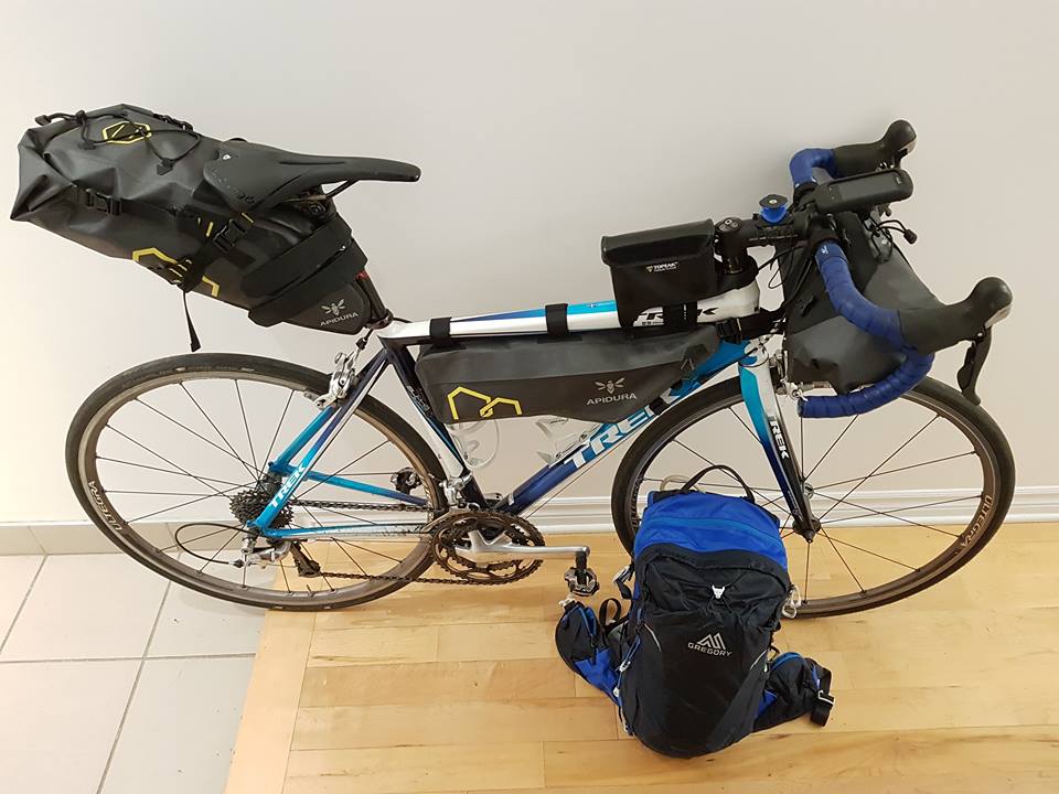 For my trip, I will have Apidura bikepacking bags for the saddle (14L), the frame (4.5L), and the hanger in the front (9L). I’ll also have a backpack (18L) with a 2L HydraPak. I will have the possibility to transport up to 4L of water in total, and there’s plenty of storage space in the bags for food and equipment. I equipped the bike with tire-free wheels to reduce the risk of punctures, cut down on resistance, and roll a little faster. I will also bring a small amount of camping equipment: sleeping bag, bivouac, mattress, knife, rope, matches, etc. I will have spare spokes and tubes and some tools to help me out if repairs are needed.